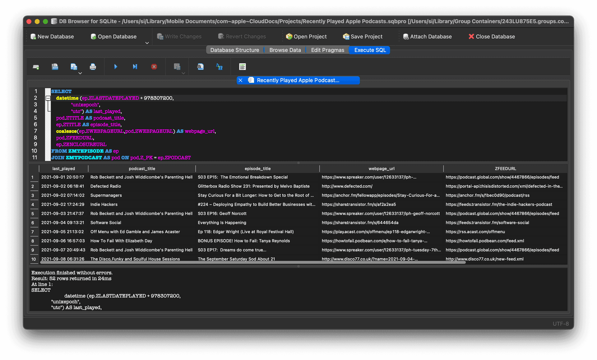 I got to work in DB Browser for SQLite – a free macOS app for, you've guessed it, browsing SQLite databases. As an ex-developer quite comfortable in SQL Server, Oracle and mySQL, the navigation tree and query structure all came flooding back quite quickly. The joins across a couple tables ended up returning the data I wanted: